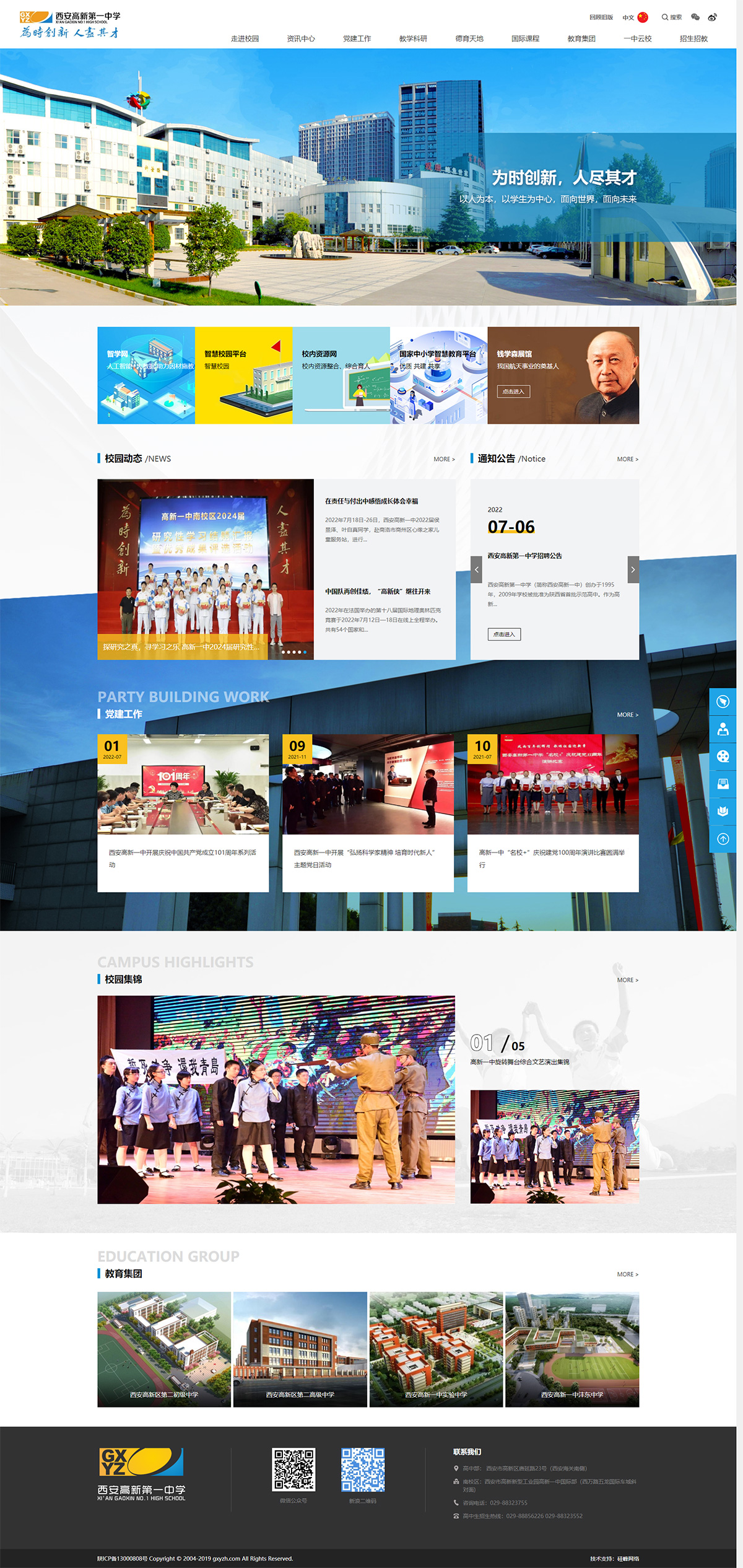 西安高新第一中學(xué)(簡(jiǎn)稱(chēng)西安高新一中)創(chuàng )辦于1995年,2009年學(xué)校被批準為陜西省首批示范高中。 學(xué)校秉承“以人為本,以學(xué)生為中心,面向世界,面向未來(lái),培養高素質(zhì)合格人才”的辦學(xué)理念,秉持“為時(shí)創(chuàng )新,人盡其才”的校訓,搭建了“一體兩翼”特色教育發(fā)展的新架構?!耙惑w”,就是以高中課程為主體,為培養高、精、尖人才夯實(shí)基礎;“兩翼” ,一是在高中開(kāi)設國際課程,拓展國際視野;二是開(kāi)設藝術(shù)教育課程,培養形象思維,收獲了豐碩成果,在省內外產(chǎn)生了積極的影響。